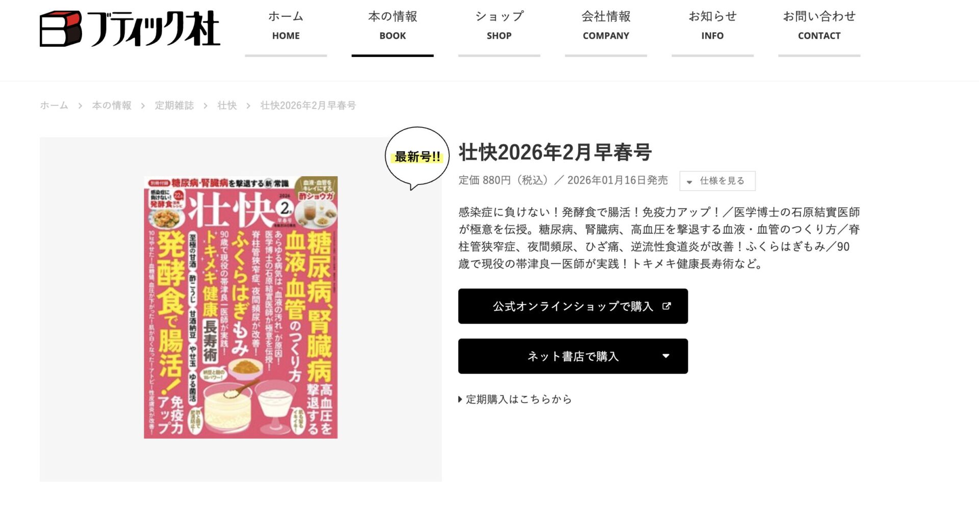 【メディア掲載】「壮快」さま取材記事掲載いただきました。 2026.01.20 一般社団法人日本腸内環境食育推進協会運営事務局ですブティック社さまより2026年1月16日に発売された「壮快2026年2月早春号」にて発酵食で腸活記事を掲載いただきました。全国の書店・Amazon・楽天にてご購入いただけます。ぜひお手に取ってご覧くださいませ。一般社団法人日本腸内環境食育推進協会運営事務局